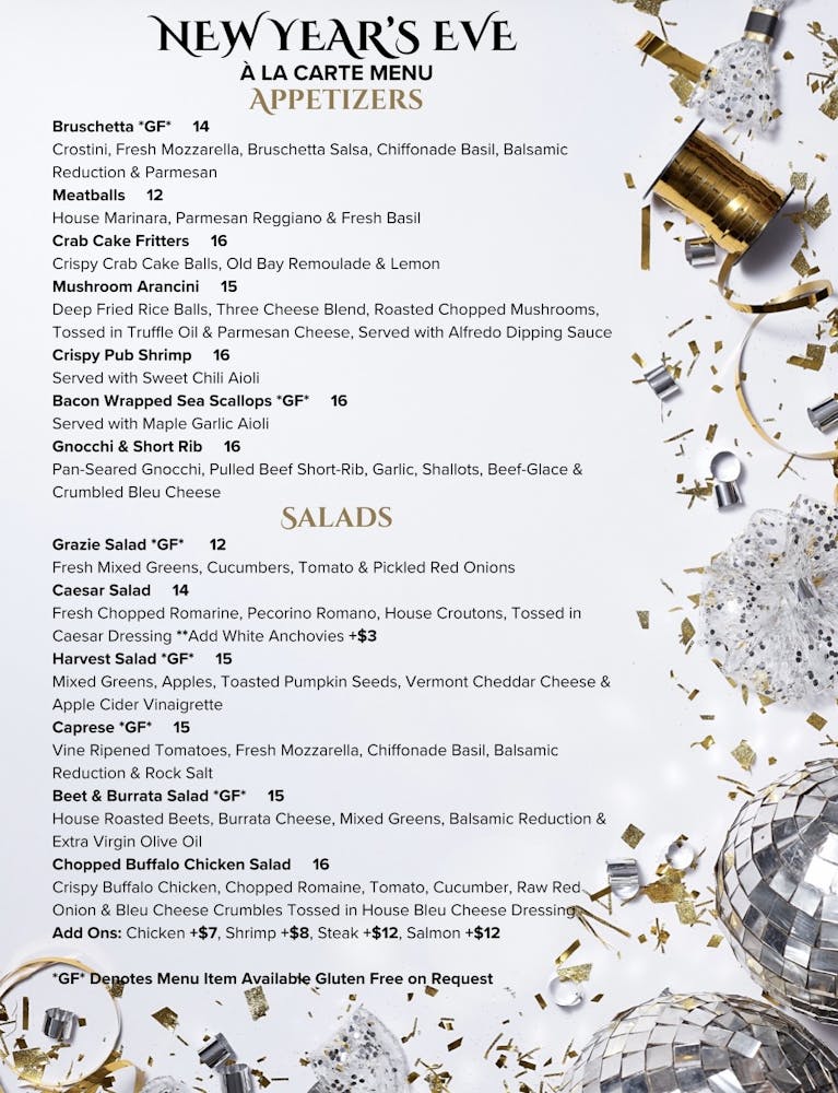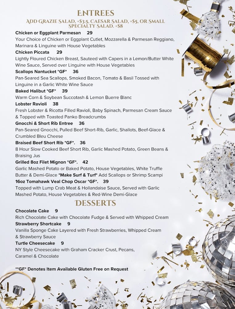 Staying in? Any of our NYE menu items & entrees are available for takeout, or any entree can be served family style for 2 with a Grazie Salad, Bread & Butter included!