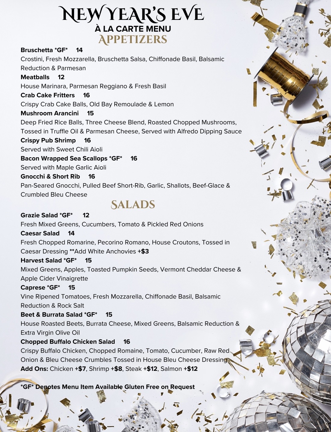 Staying in? Any of our NYE menu items & entrees are available for takeout, or any entree can be served family style for 2 with a Grazie Salad, Bread & Butter included!
